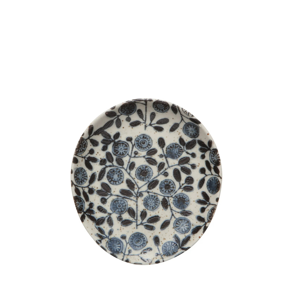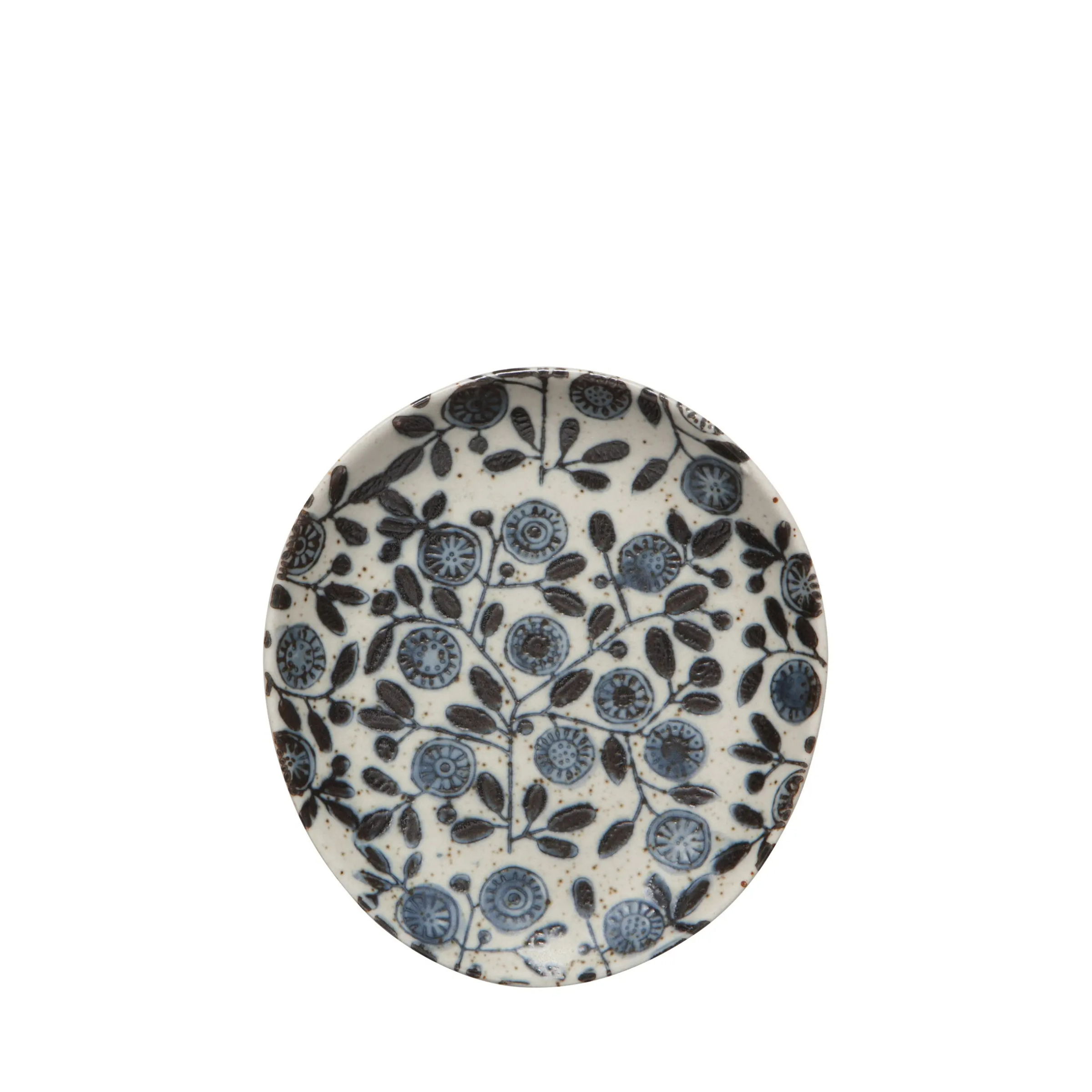 Keep your counter clean with this stoneware spoon rest. Or use it as a charming hors d'oeuvres plate. Illustrated calendula flowers in shades of blue with a gray background, in an oblong organic shape.