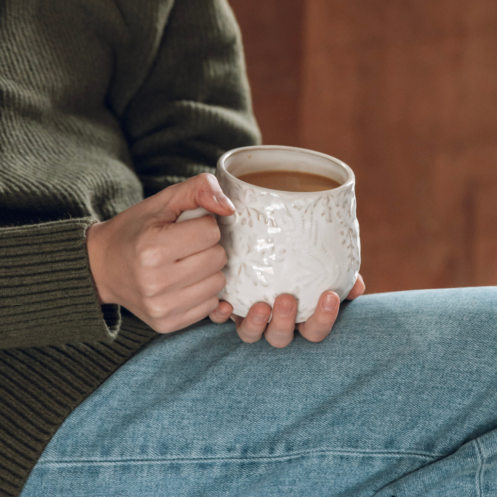 Its creamy tones and hand-touched texture capture the quiet magic of falling snow, making it perfect for coffee, cocoa, or tea by the fire. A cozy addition to your holiday collection and an instant favorite for gifting or everyday use.