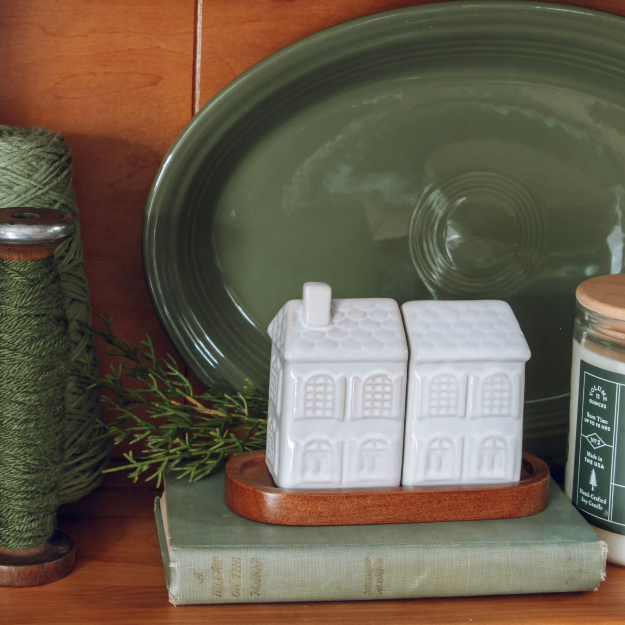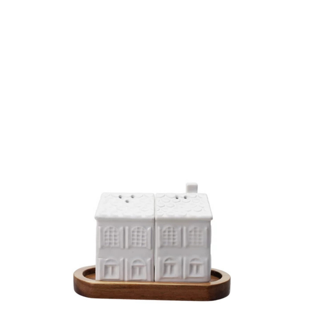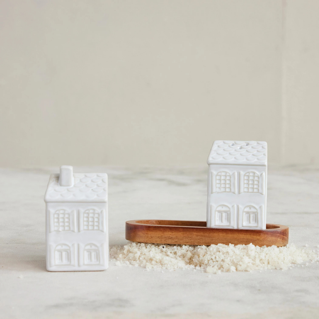 Add a touch of home to every table with our Stoneware Cottage Salt & Pepper Set. This three-piece set includes two creamy white, house-shaped shakers and a natural wood tray — a simple, beautiful nod to cozy gatherings and heartfelt meals.