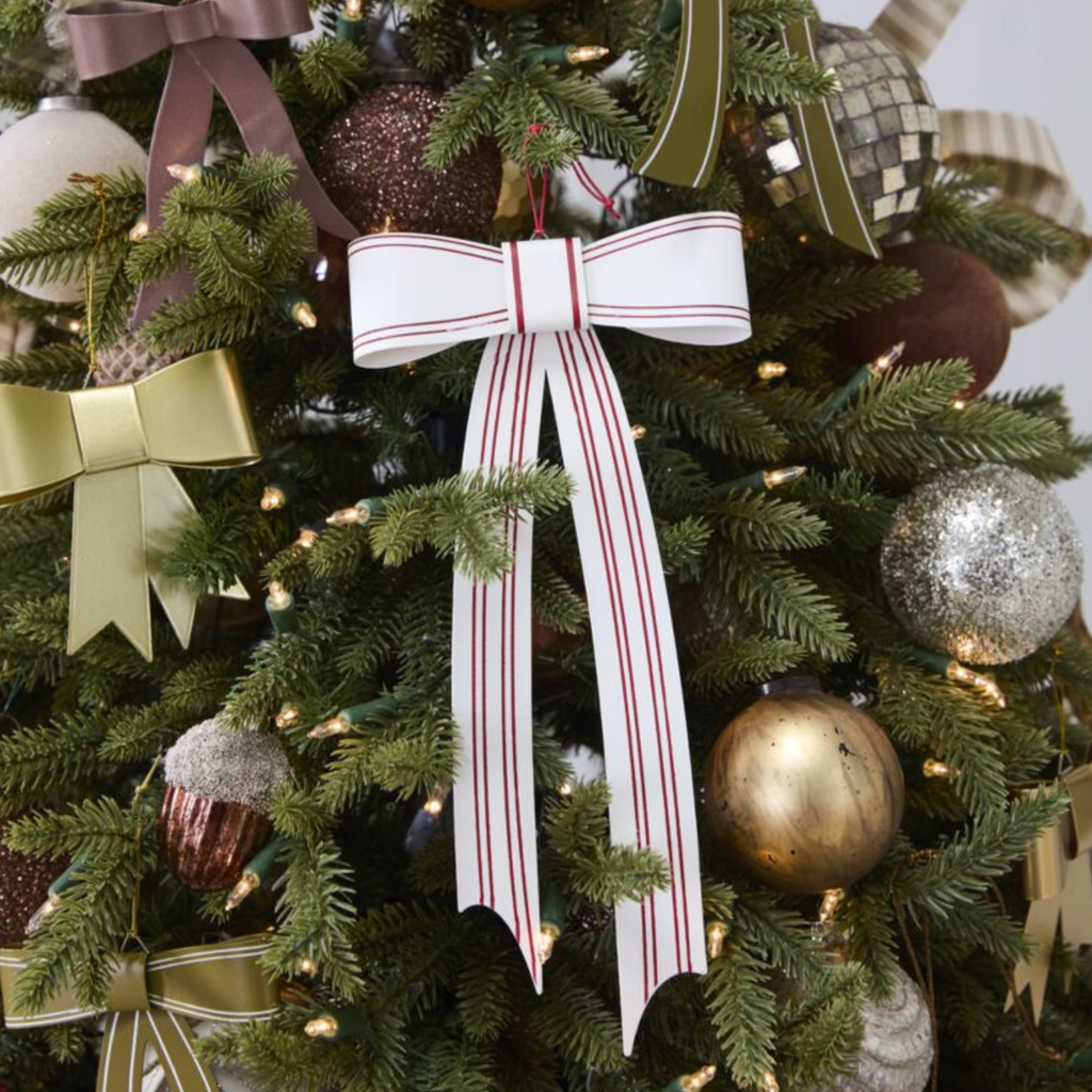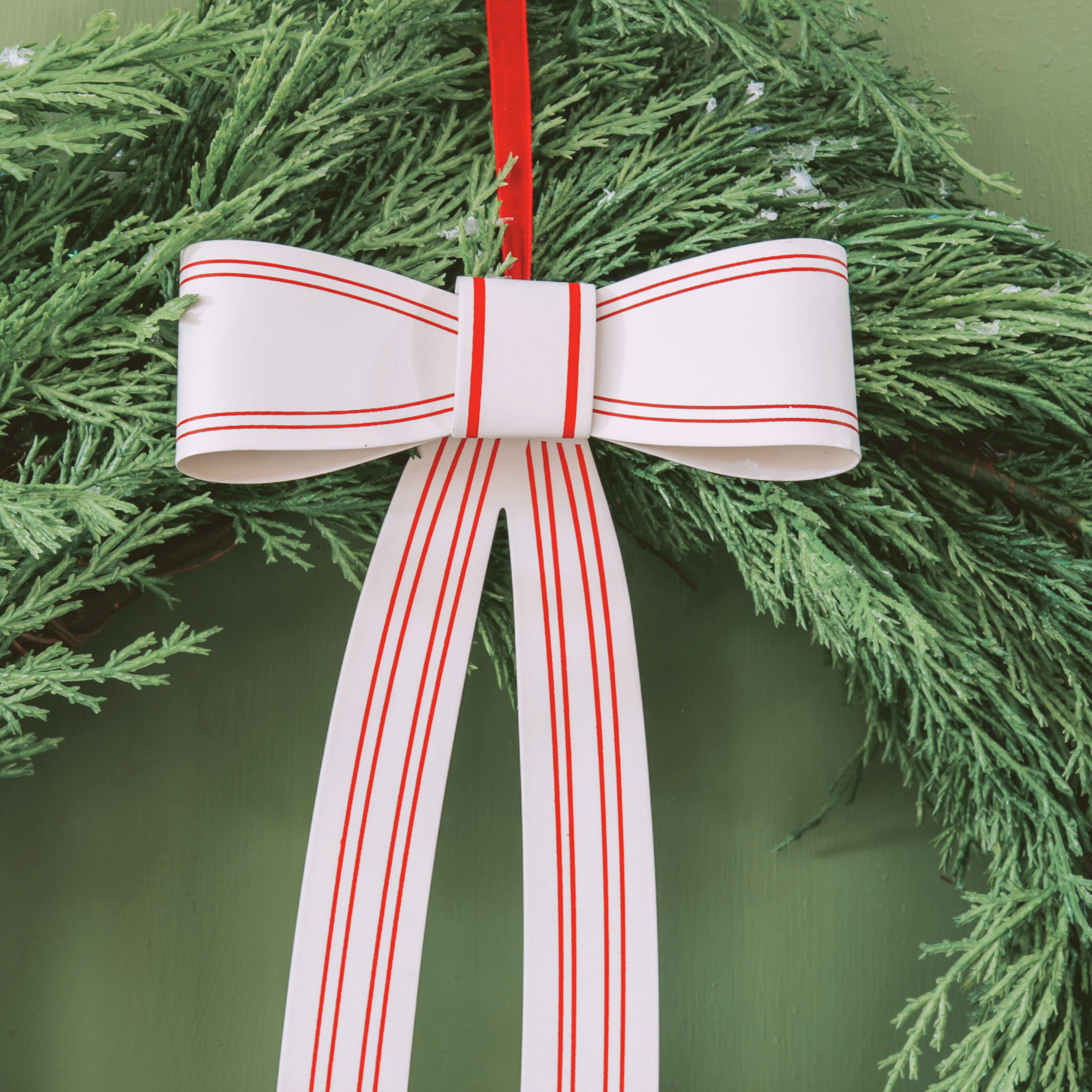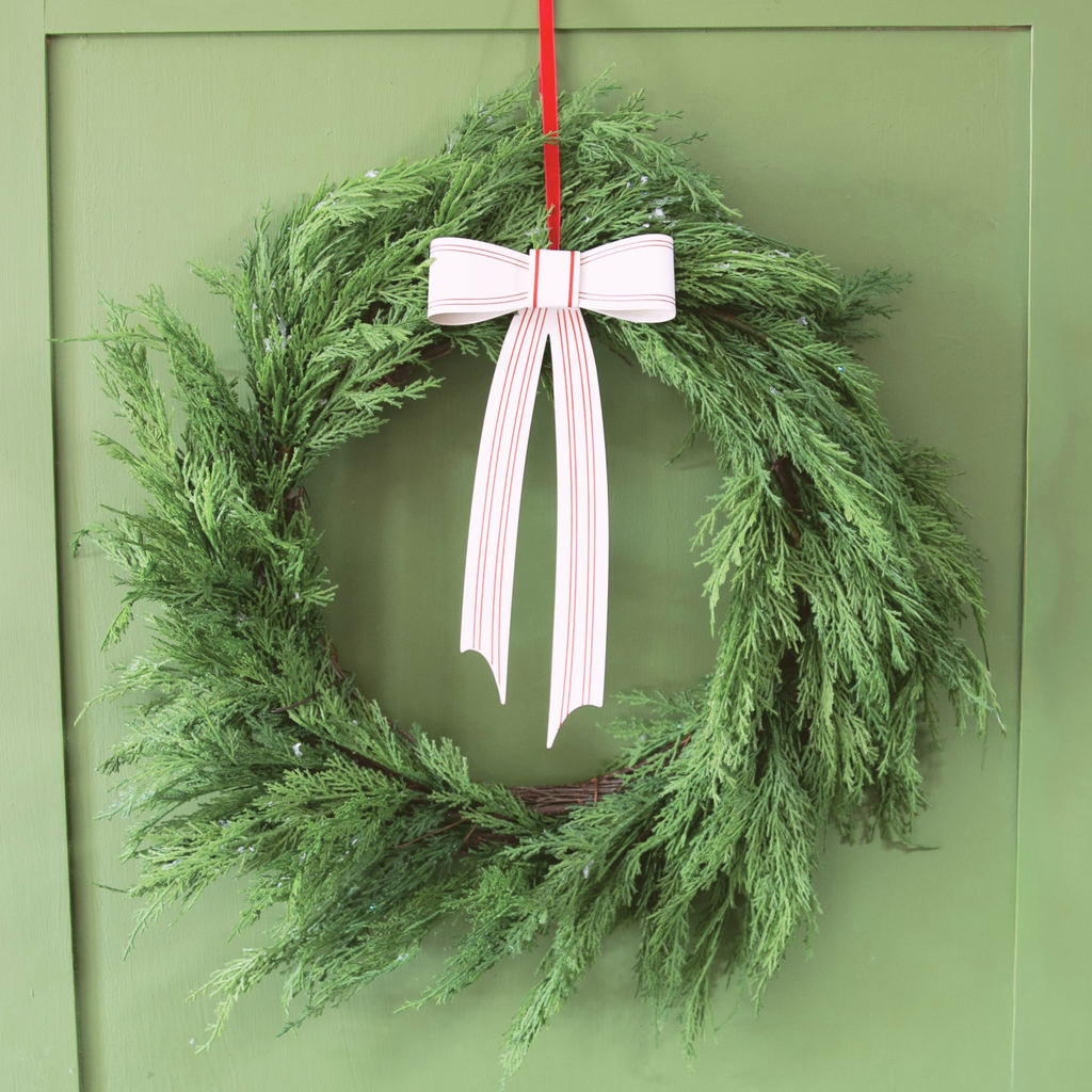 Our Welcome Home Bow Ornament – Large brings a bold, festive statement to your holiday decorating. Crafted of lightweight metal with a white background and red stripes, its perfectly shaped loops and square center create a dimensional look that feels both classic and fresh.