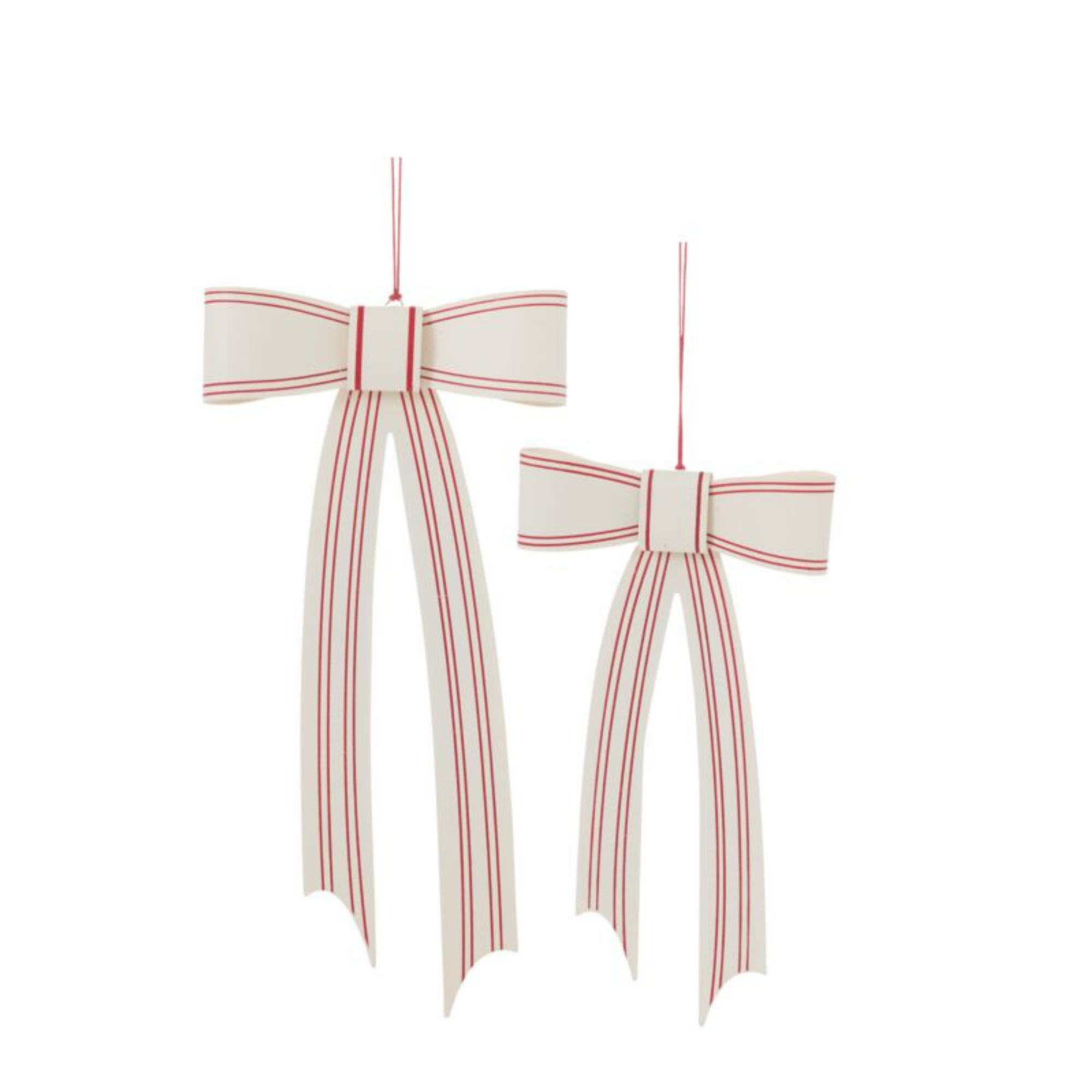Simple and classic, our Welcome Home Bow Ornament is a lightweight metal bow with a white background and cheerful red stripes. Perfectly tied with dimensional loops and a square center, it hangs from a red string for a timeless touch.