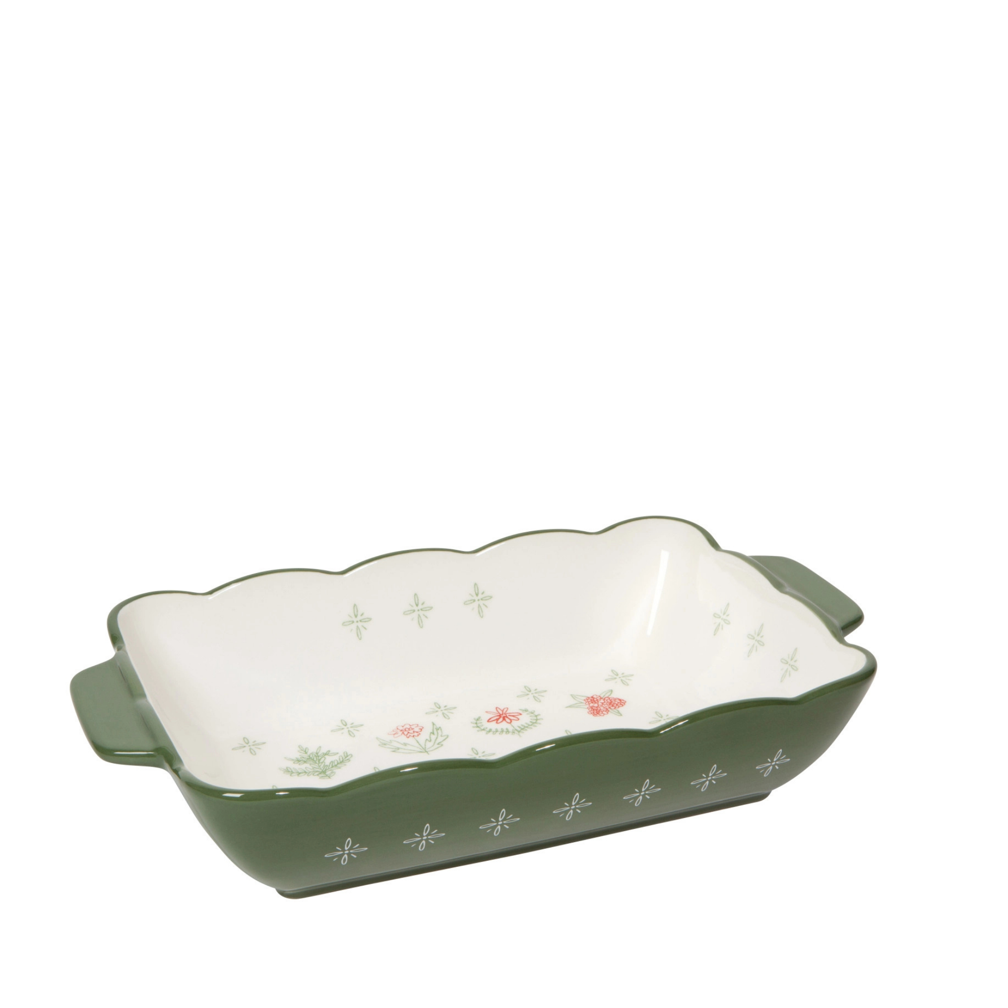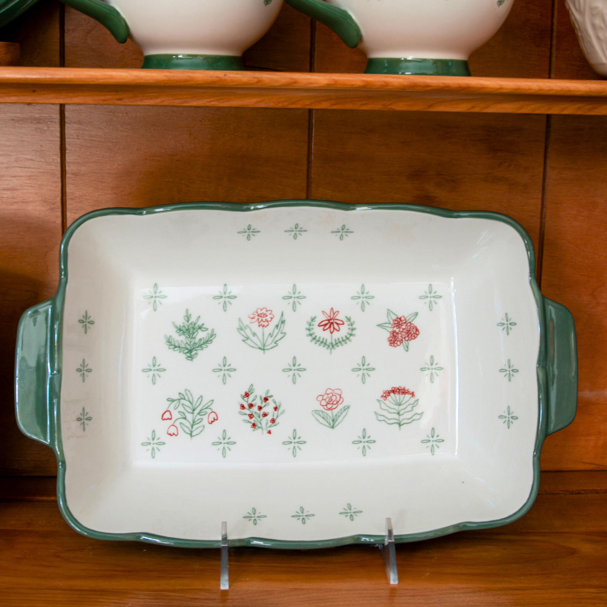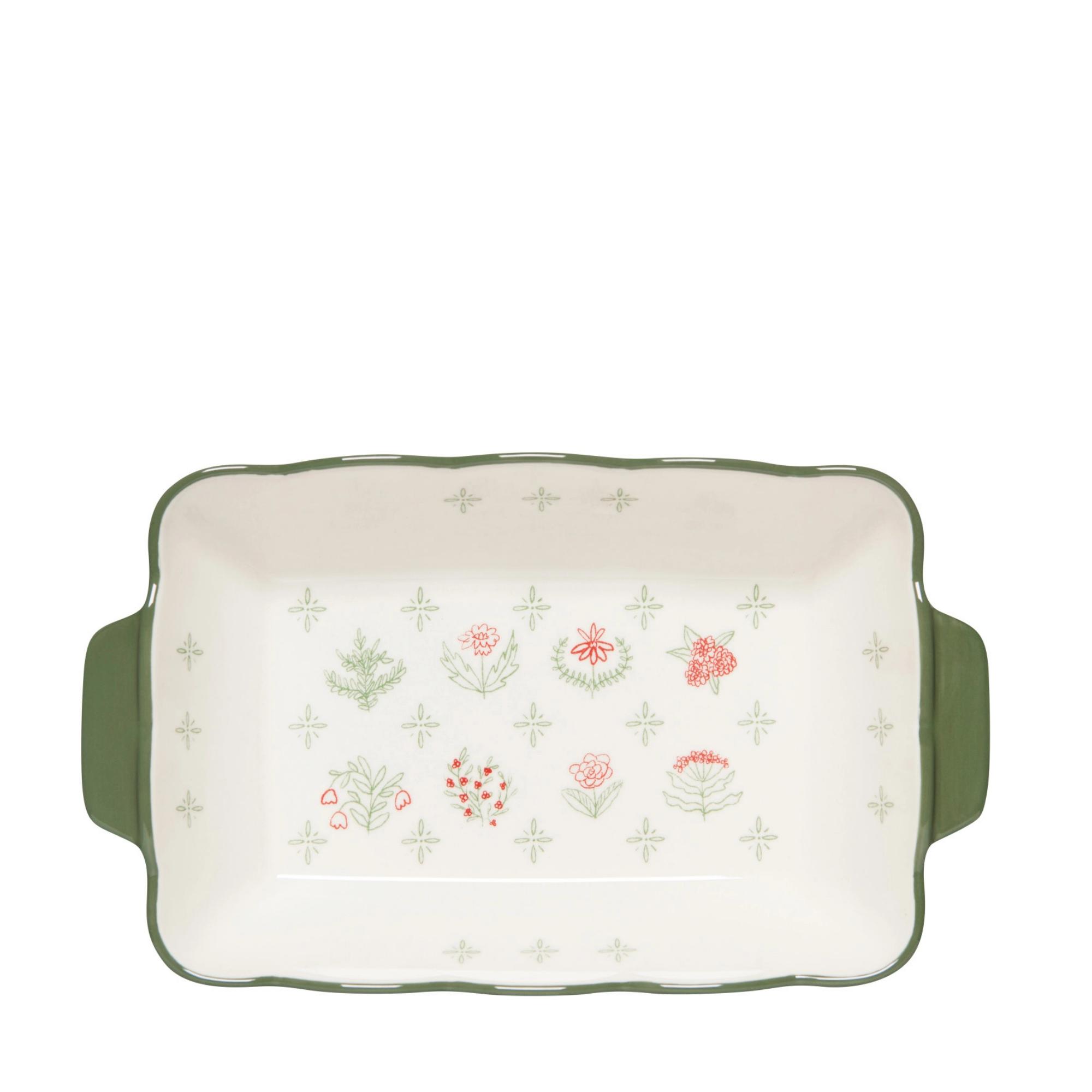 Whether baking something sweet or savory, our Laurel Hill Stoneware Baking Dish brings rustic charm and effortless style to your kitchen. Delicate flowers in soft sage green, wine red, and bright white create a vintage-inspired pattern that feels both fresh and timeless.